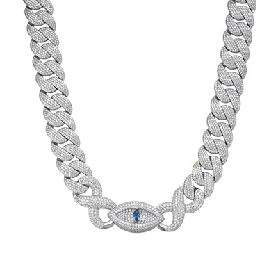 Sterling Silver Round Moissanite 15mm Inifinity Cuban With Evil Eye Designer 22 Inch Mens Necklace RP 27-1/8 Cttw