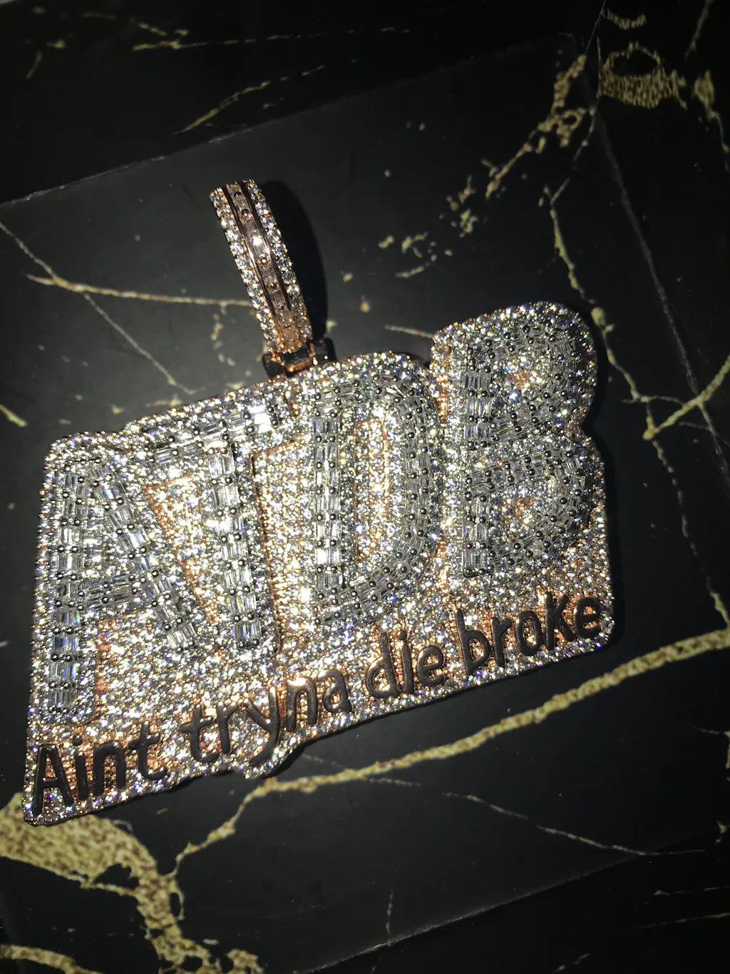 14k - Iced Out Baguette X Pave "Ain't Tryna Die Broke" Pendant. This style is one of the most popular styles among celebrities, and will have people asking where you copped! In other words, it's one of a kind!